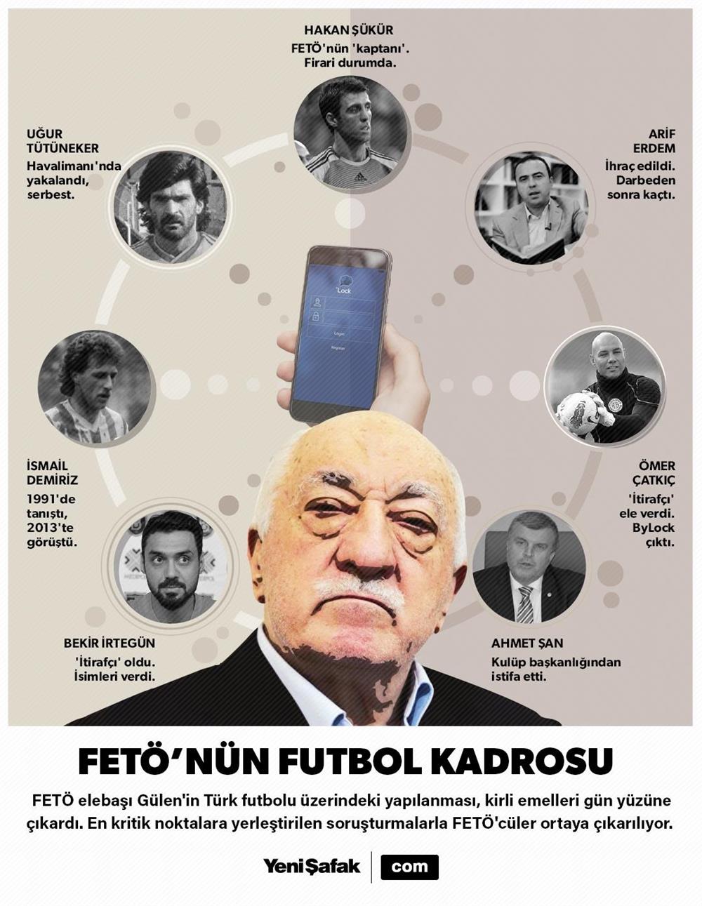 Darbe girişiminin ardından FETÖ'nün 81 ildeki yapılanmasına yönelik operasyonlar kapsamında futbol alanında gün yüzüne çıkan gelişmeler bir yıldır dikkatleri çekiyor. FETÖ'nün 'kaptanı' Hakan Şükür'ün yanı sıra son günlerdeki operasyonlarla yeni yeni bağlantılar ortaya çıkarılıyor. Futbolculuktan hakemliğe kalecilikten antrenörlüğe kadar işte FETÖ'nün yeşil sahalardaki gölge kadrosu!
