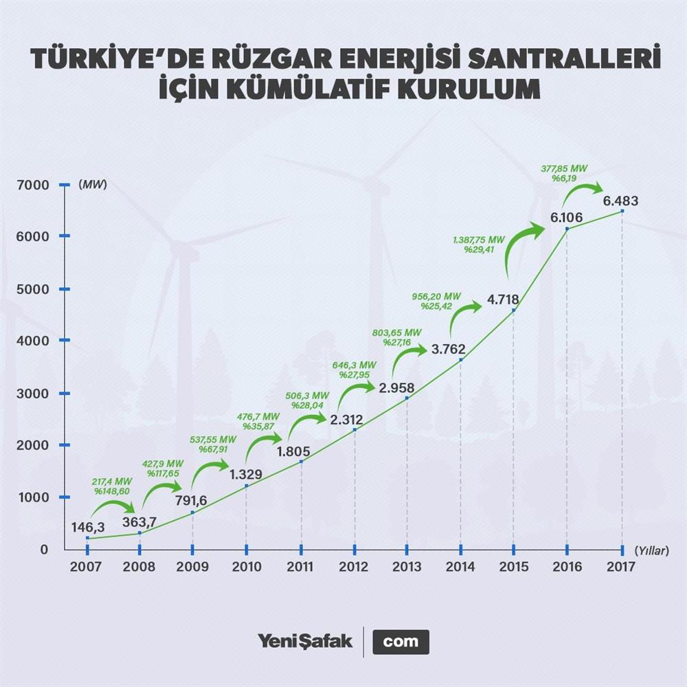 Türkiye 2016 yılında gerçekleştirdiği 1.387 MW’lık kurulu güç ile Avrupa’da rüzgar sektöründe ilk üç arasına girmişti ve Dünyada ise yedinci sırada yer almıştı. 2017 yılının ilk yarısında bu yükseliş hız kesti. Buna rağmen ilk altı ayda gerçekleşen rüzgar yatırımlarıyla 398 milyon dolar civarında enerji ithalatının önüne geçilmiş oldu. 440 bin haneye daha rüzgar sayesinde elektrik ulaştırılmış oldu. Toplamda 7,5 milyon hanenin elektriği rüzgardan karşılandı.