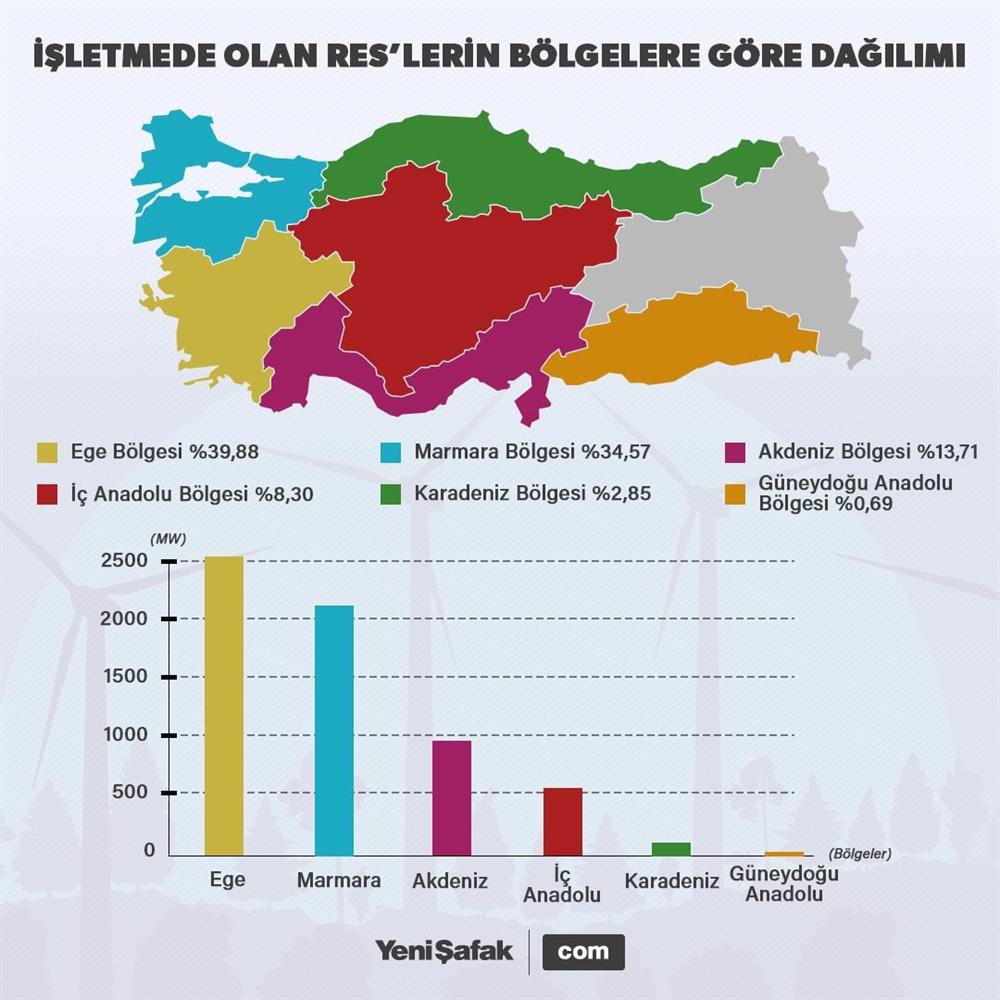 Rüzgarın elektrik üretimi içindeki payı her geçen yıl artıyor. Yenilenebilir Enerji Genel Müdürlüğü verilerine göre, Türkiye'nin 10 bin MW deniz üstünde, 38 bin MW karada olmak üzere toplam 48 bin MW’lık tekno ekonomik rüzgar potansiyeli var.