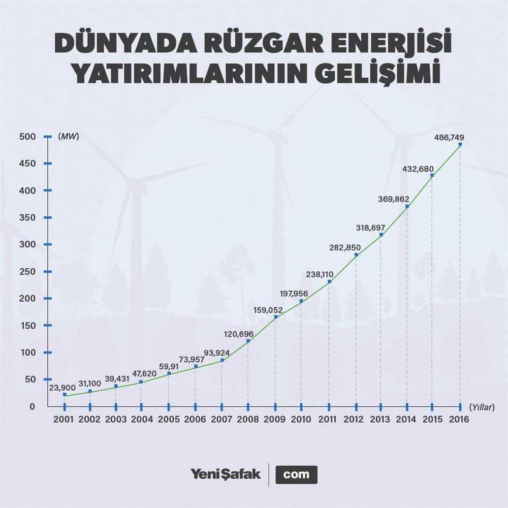 Dünyada rüzgar enerji yatırımları yükseliş trendini sürdürüyor. 2001 yılında 23 bin MW olan RES yatırımları 2016 yılında 486 bin MW seviyesine kadar çıkmış durumda.