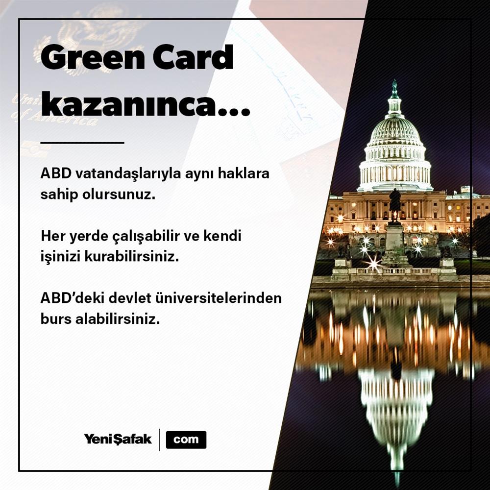 - Green Card sahibi bir kişinin eşi ve 21 yaşın altındaki tüm bekâr çocukları da ABD'de ömür boyu oturma ve çalışma hakkına sahip olur.
