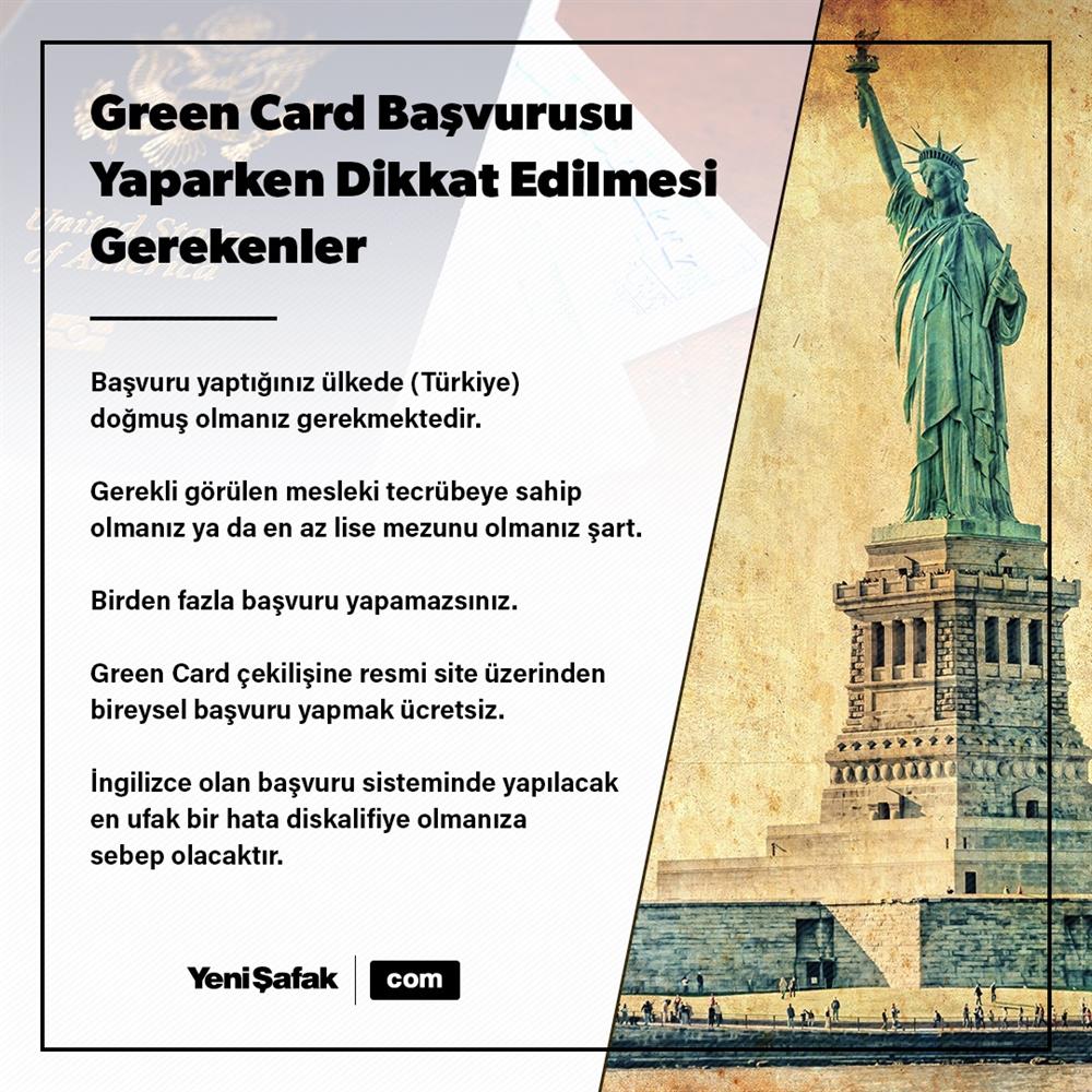 Green Card çekilişi için başvuru yapılabilen bir aylık süre içinde Türkiye’den yaklaşık 100 bin başvuru yapılıyor. Ancak bu başvuruların yalnızca 20 bin kadarı işleme alınıyor. Bu durum başvuru formunun doldurulması esnasında yapılan hatalardan kaynaklanıyor. Bu nedenle tamamı İngilizce olan başvuru formlarının çok dikkatli olarak doldurulması ve gerekirse profesyonel yardım alınması öneriliyor.
