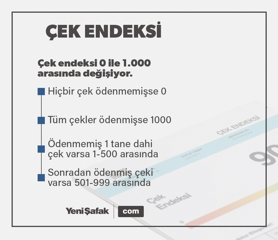 Çek sahibi kişi ya da kurum, keşide ettiği hiçbir çeki ödemezse Çek Endeksi 0, tüm çeklerini öderse 1.000 ‘dir. Bununla beraber kişinin arkası yazılmış, ancak halen ödenmemiş 1 tane dahi çeki olması durumunda Çek Endeksi 1 ile 500 puan arasında gerçekleşir. Arkası yazılmış, sonradan ödenmiş çeki bulunan kişi ya da kurumlara ait Çek Endeksi 501-999 arasında gerçekleşir.