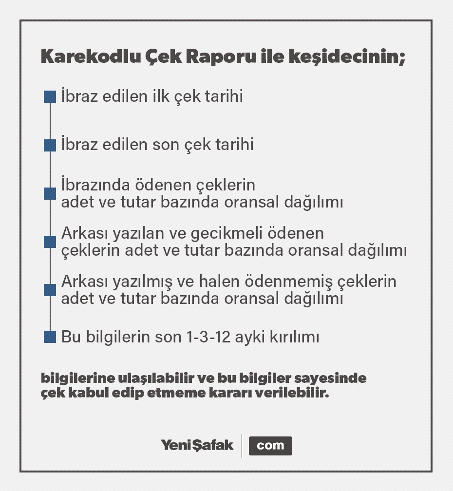 Çek üzerindeki bilgilerin sistemden gelen bilgilerle karşılaştırılabiliyor olması da sahteciliğe ve dolandırıcılığa karşı tedbir alınmasını mümkün kılacak. Keşidecinin çek ödeme geçmişine dair tüm bilgiler tek bir raporda görülerek çekin ödenme olasılığı öngörülebilecek.