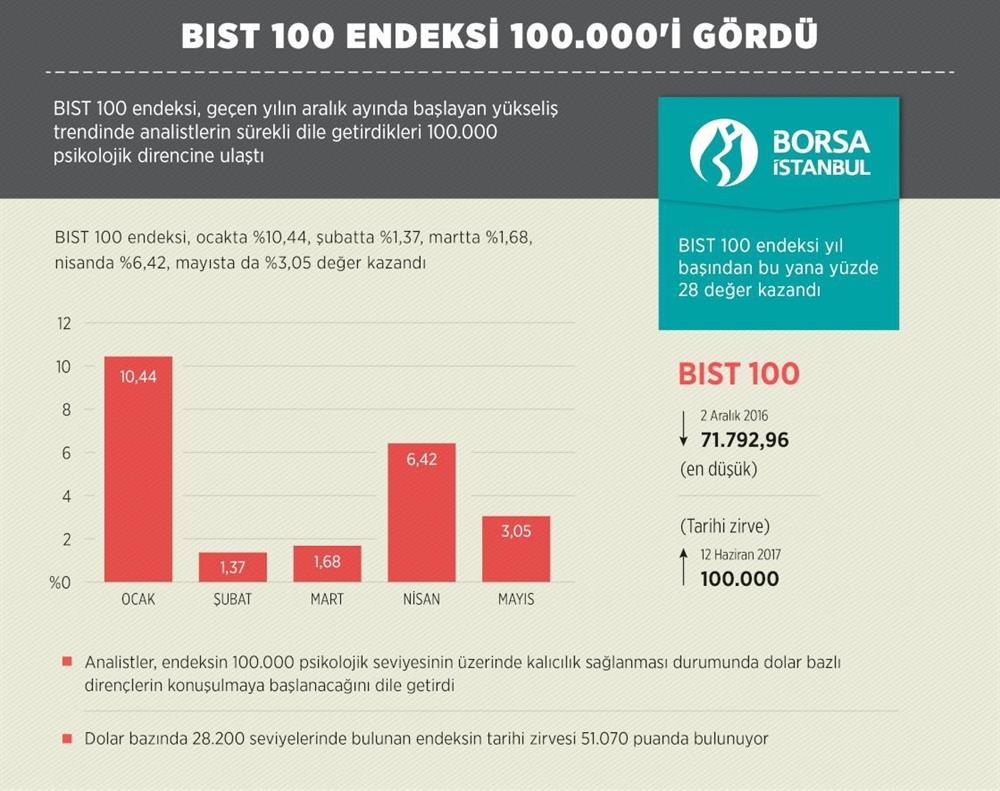 Borsa İstanbul'da BIST 100 endeksi 13 Haziran 2017 tarihinde 100 bin bandını aştı ve tarihi bir kırıldı.