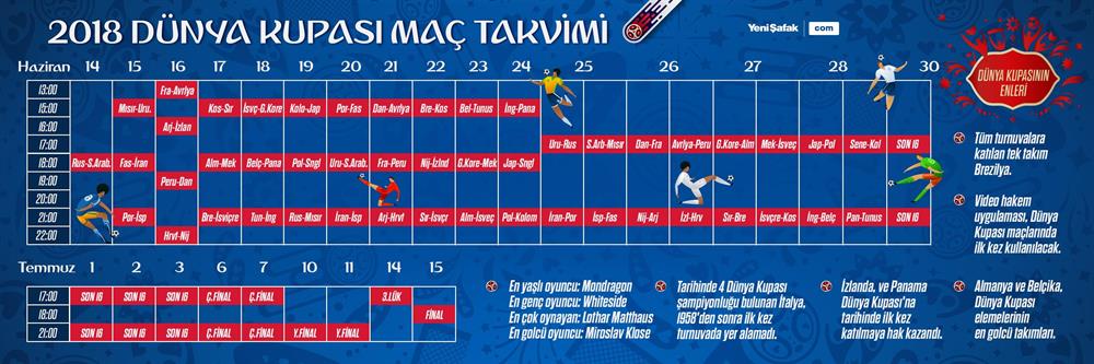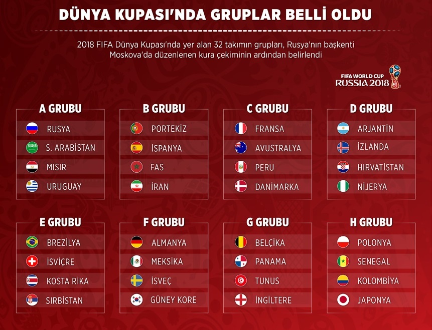 2018 Dünya Kupası, 14 Haziran Perşembe günü Rusya'da Rusya-Suudi Arabistan maçıyla başlıyor. Dünyanın en iyi oyuncularının sahne alacağı turnuva TRT'den yayınlanacak. Rusya'nın ev sahipliği kontenjanı nedeniyle doğrudan katıldığı FIFA 2018 Dünya Kupası'nda yer alan 32 takım, 8 gruba ayrılıyor. Gruplarını ilk iki sırada tamamlayan takımlar, adlarını son 16 turuna yazdıracak. 2018 Dünya Kupası'ndaki grupların analizi, maç fikstürü ve turnuvada yaşanacak ilkleri sizler için bilgi kartında maddelendirdik.