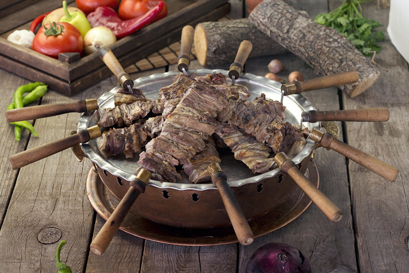 Bir günün sonunda, yaprak halindeki etleri, kebaba özel olan şişe takın ve yatık haldeyken ateşte çevirerek kızartın.