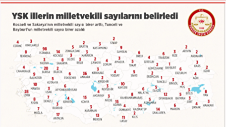 Yüksek Seçim Kurulu'nun illerin çıkaracağı milletvekili sayısı ve seçim çevrelerine ilişkin kararı Resmi Gazete'de yayımlandı. Kararda, sayıların Türkiye İstatistik Kurumu Başkanlığı'nın 2022 yılı nüfus bilgileri esas alınarak hesaplandığı belirtildi. İstanbul'un 98 milletvekili ile 3, Ankara'nın 36 milletvekili ile 3, İzmir'in 28 milletvekili ile 2 ve Bursa'nın da 20 milletvekili ile 2 seçim çevresine bölündüğü kaydedildi.