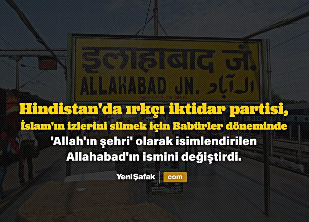 - Hindistan'da ırkçı iktidar partisi, Babürler döneminde 'Allah'ın şehri' olarak isimlendirilen Allahabad'ın ismini değiştirdi. Müslümanların tepki gösterdiği olaya Hindistan Yüksek Mahkemesi eski Başkanı Markandey Katju'dan da destek geldi. Katju, "Allahabad demeye devam edeceğiz" dedi.