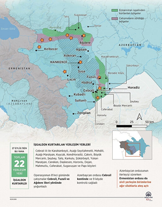 Ermenistan’ın işgal ettiği Dağlık Karabağ’da hızla ilerleyen Azerbaycan ordusu harekatın dokuzuncu gününde Cebrail şehrinin de aralarında bulunduğu 22 yerleşim yerini kurtardı. Kurtarılan bölgelerde 28 yıl sonra Azerbaycan bayrağı yeniden dalgalanırken, minarelerden ezan sesi yükselmeye başladı.