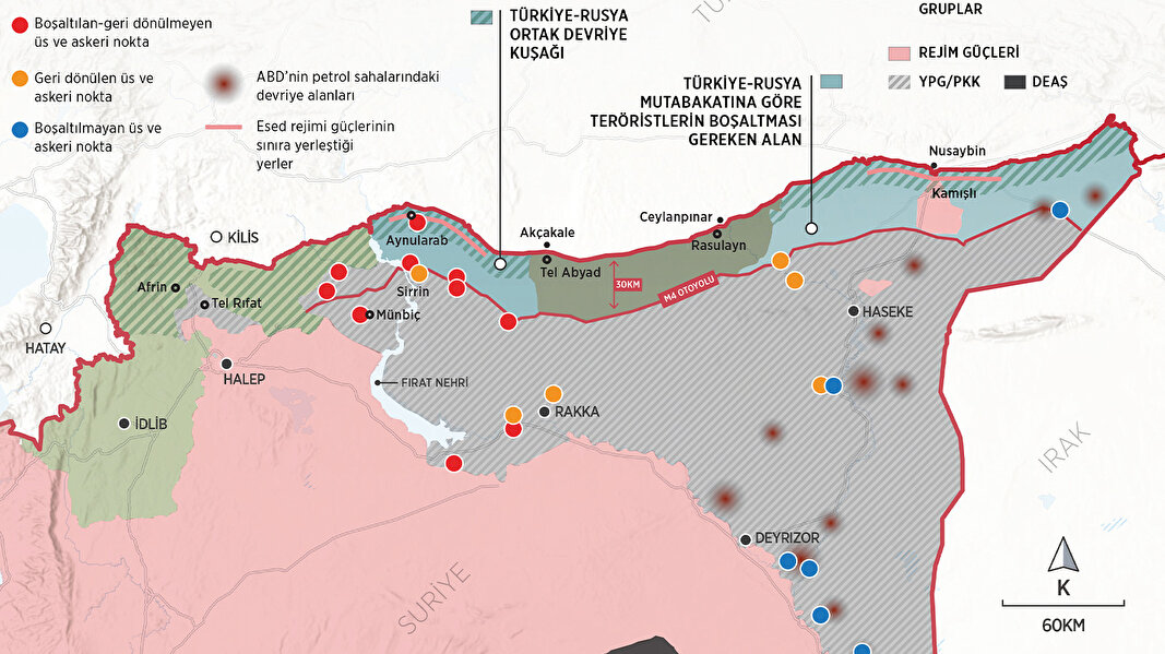 Türkiye’nin operasyonları başlayınca 16 noktadan askerlerini çekerek kendi kamplarına bomba yağdıran ABD, Türkiye sınırındaki 4 gözlem noktasını da boşaltmıştı. Buna karşın Deyrizor’daki petrol sahalarından çekilmeyen Amerika, şimdi oraya ek üsler yapmasının yanında, daha önce boşalttığı 6 üsse de geri döndü. Haseke ilinde terk ettiği tüm askeri noktalara ve Ayn el-Arab’ın güneyinde M4 karayolu üzerindeki Sırrin üssüne yeniden yerleşen Pentagon, Rakka’nın Cezre beldesindeki üssüne de geri döndü. Bunun yanında Sırrin’deki durumun belirsiz olduğu, ABD askerlerinin büyük kısmının çekildiği, kalan kısmının da çekilmesinin beklendiği öğrenildi. Süreç boyunca Münbiç ilçesine ise hiç dönüş olmadı.
