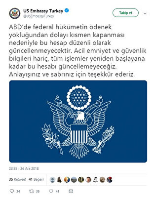 ABD'de federal hükümet, Meksika sınırına örülen duvarın finansmanı nedeniyle yaşanan bütçe krizi sonucu kapandı. Bu durum, ABD Ankara Büyükelçiliği ile İstanbul ve Adana konsolosluklarının sosyal medya hesaplarını da etkiledi