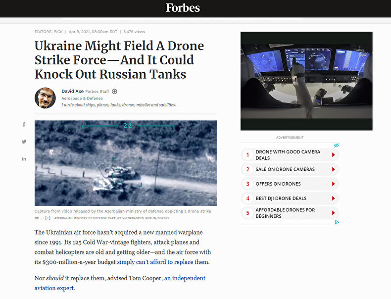 Amerikan Forbes dergisi, Ukrayna ve Rusya arasındaki krize dair bir makale yayımladı. Yazıda, Ukrayna’nın savaş uçaklarının Rusya’ya karşı direnemeyeceği fakat Türkiye’den alınan Bayraktar TB2 SİHA’ların Rus savunma sistemlerini devre dışı bırakabileceği görüşüne yer verildi. Karabağ’da yaşananlar örnek verilerek, "Türk İHA’ları Ermeni güçlerini kasıp kavurdu" ifadesi kullanıldı.