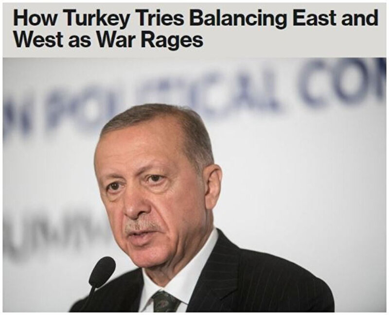 Türkiye, savaşan iki ülke olan Rusya ile Ukrayna arasında denge politikasını sürdürerek, tüm dünyanın takdirini topladı. Denge politikası sayesinde Karadeniz üzerinden güvenli tahıl koridoru hayata geçti. Karşılıklı esir takasının yapılması sağlandı. Bloomberg, Türkiye'nin ABD ve Batı'nın politikalarına meydan okuduğunu, Washington liderliğinde Moskova'ya uygulanan yaptırımlara katılmadığını yazdı. Kiev ile olan yakın ilişkilerin yanı sıra Rusya ile diyaloğa işaret edilerek, Moskova'dan ikinci nükleer santralin inşasının istendiği belirtildi.