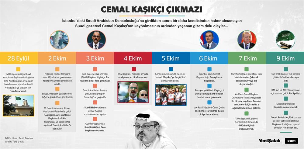 Aynı gün Emniyet kaynakları, Kaşıkçı'nın 2 Ekim'de evlilik işlemleri için gittiği Suudi Arabistan Başkonsolosluğu'ndan bir daha çıkmadığı bilgisini teyit etti. Kaynaklar, başkonsolosluk binasında aynı saatlerde, 2 uçakla İstanbul'a gelen aralarında yetkililerin de yer aldığı 15 Suudi vatandaşın bulunduğunun, bu kişilerin daha sonra geldikleri ülkelere döndüklerinin belirlendiğini bildirdi.