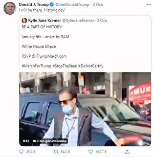 - Tüm dünyanın şaşkınlıkla izlediği olaylarda bir ayrıntı FBI’yı harekete geçirdi. Kyle Jane Kremer adlı Trump destekçisinin 19 Aralık 2020’de“6 Ocakta Washington’da olacağız” paylaşımında bulundu. Kyle Jane Kremer’ın tweetine yanıt veren Trump, “6 Ocak tarihi gün. Orada olacağım” ifadelerini kullandı. ABD medyası, FBI’ın Trump destekçisi Kyle Jane Kremer ve Donald Trump’ın paylaşımının araştırılacağını ve paylaşımların yaşanan gerilimlerin delili olarak kullanılacağını yazdı.