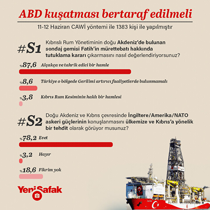 AREDA Araştırma'nın anketine göre, Türk halkının yüzde 87'si Kıbrıs Rumlarının Doğu Akdeniz'de bulunan sondaj gemisi Fatih'in mürettebatı hakkında tutuklama kararı çıkarmasını 'alçak ve tahrik edici bir hamle' olarak değerlendiriyor. Amerikan askerlerinin Doğu Akdeniz ve Kıbrıs'ta konuşlanmasını tehdit görenlerin oranı ise yüzde 78.
