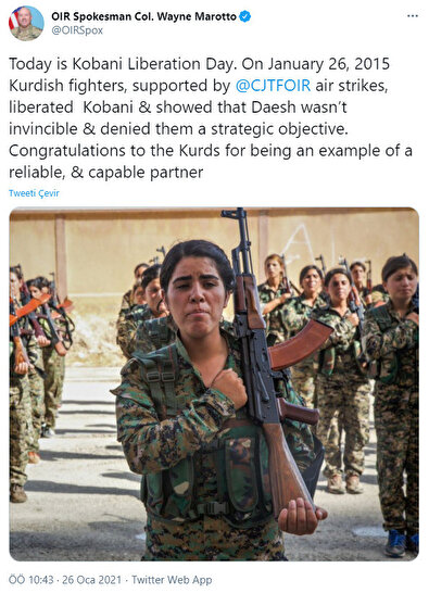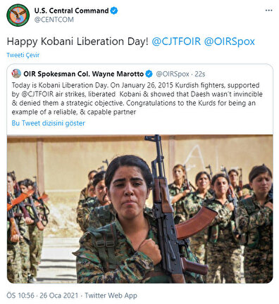 “Bugün Kobani Kurtuluş Günü. 26 Ocak 2015'te Kürt savaşçılar, OIR'in hava saldırı desteği ile Kobani'yi kurtararak IŞİD'in yenilmez olmadığını gösterdi ve elinden stratejik bir hedefi aldı. Güvenilir ve yetenekli bir ortaklık örneği gösterdikleri için Kürtleri tebrik ediyoruz”