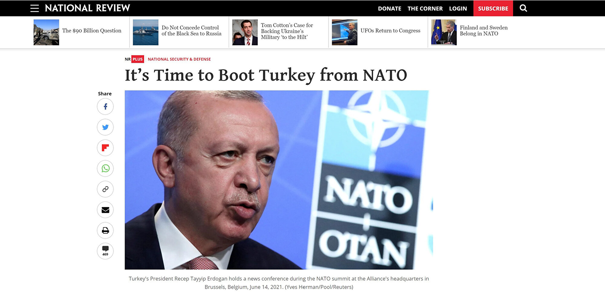 Cumhurbaşkanı Recep Tayyip Erdoğan, NATO'ya girmek için başvuruda bulunan İsveç ve Finlandiya'ya, terör örgütlerine açıkça destek vermelerinden dolayı kapıyı net bir şekilde kapattı. Birçok ülke arabuluculuk ve ikna için harekete geçse de ABD'den küstah bir çıkış geldi. National Review isimli dergi, "Türkiye'yi NATO'dan atma vakti" başlıklı bir yazı yayımladı. Küstah yazıda, "İsveç ve Finlandiya'yı barındıran ancak Türkiye'yi dışlayan bir NATO, Türkiye'yi içeren ancak İsveç ve Finlandiya'yı dışarıda tutan bir NATO'ya tercih edilir." şeklindeki görüş savunuldu.