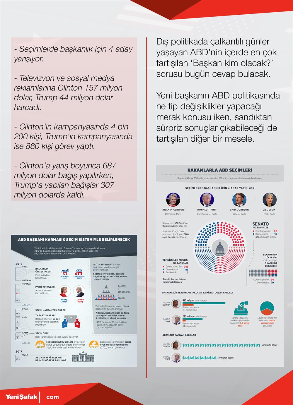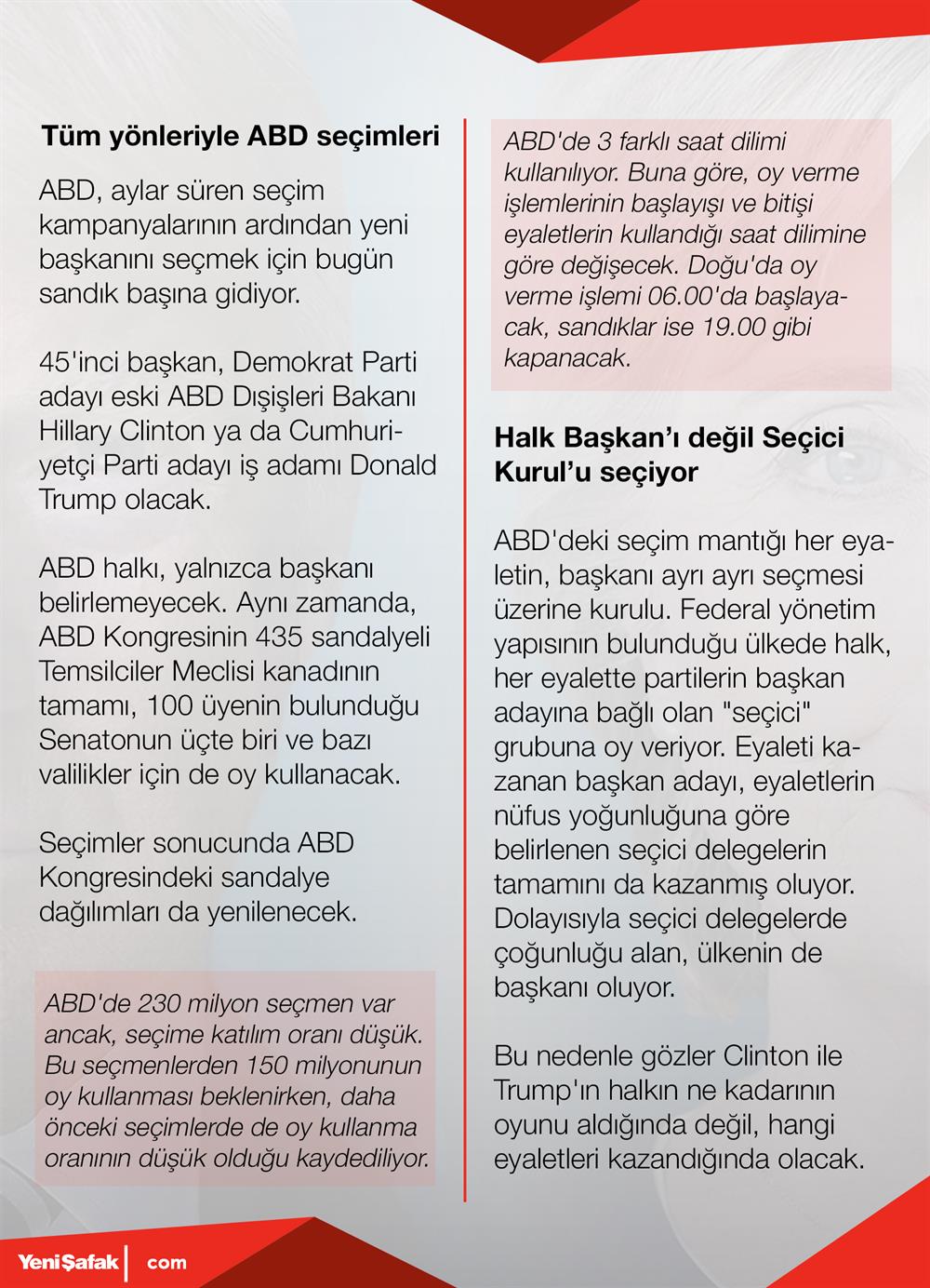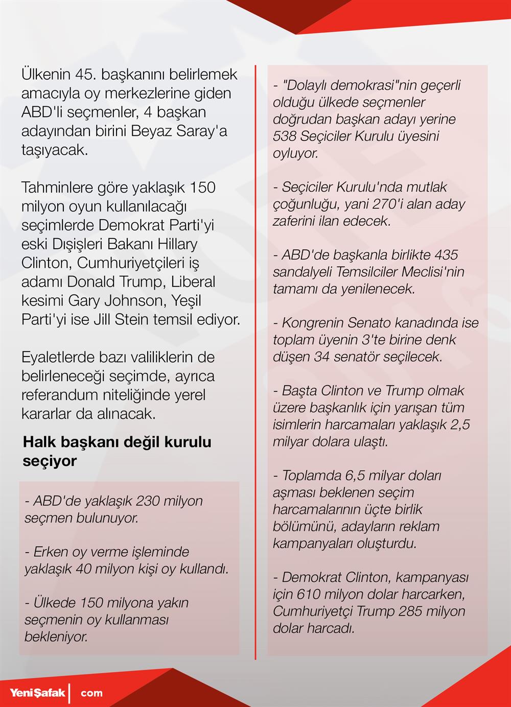 Amerikalı seçmenler Demokrat Parti adayı Hillary Clinton ile Cumhuriyetçi Parti adayı Donald Trump arasında karar veriyor. "Savaş alanı" olarak nitelendirilen Ohio, Pensilvanya, Florida, Kuzey Carolina gibi çekişmeli eyaletler seçimin kaderini belirleyecek.