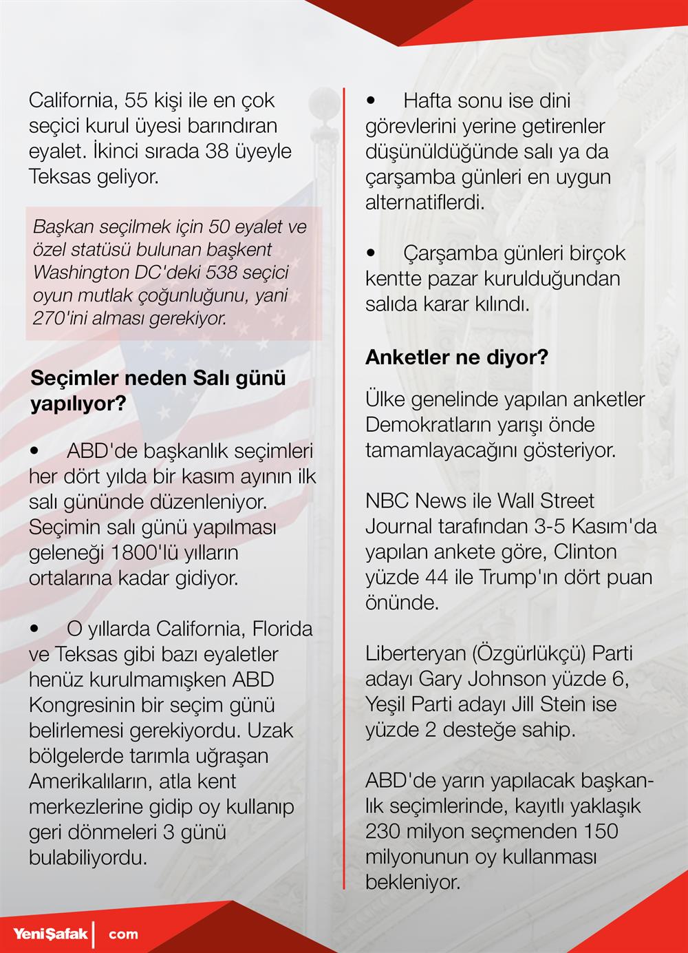 ABD'de milyonlarca seçmen, başkanı belirlemek için sandık başında. ABD seçimlerine dair merak edilen her detay, başkanlık seçiminin nasıl işlediği, eyaletlerin önemi ve daha birçok detay yenisafak.com'un hazırladığı seçim kılavuzunda.