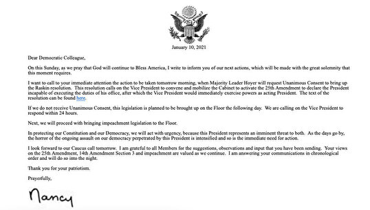 ABD Temsilciler Meclisi Başkanı Nancy Pelosi, Başkan Yardımcısı Pence'e, Trump'ın görevden alınması işlemleri için 24 saat süre verileceğini, gerekli adımın atılmaması halinde Trump'ın azil sürecine derhal başlayacaklarını açıkladı.