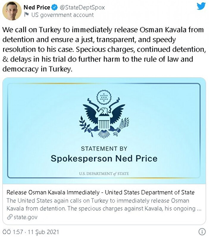ABD Dışişleri Bakanlığı, yaklaşık 3 yıldır tutuklu bulunan Osman Kavala'nın 'derhal serbest bırakılması' çağrısı yaptı.