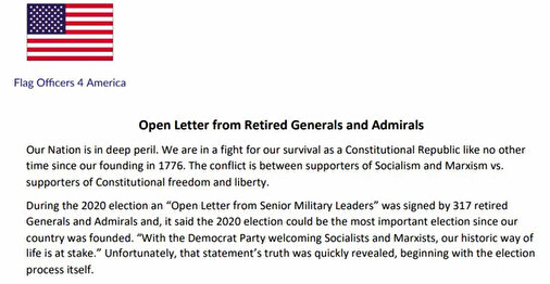 - Mektupta,“Ulusumuz büyük bir tehlike içinde. 1776’daki kuruluşumuzdan bu yana hiçbir zaman olmadığı kadar anayasal olarak hayatta kalma savaşı veriyoruz. Çatışma, anayasal hürriyet ve özgürlük taraftarlarına karşı Sosyalizm ve Marksizm taraftarları arasındadır”denilerek Kasım 2020’deki ABD başkanlık seçimleri öncesinde 317 ABD’li emekli general tarafından yazılan uyarı mektubunun, Demokratların iktidardaki sol ve Marksist eğilimleri nedeniyle bu iddialarının doğru çıktığı vurgulandı.