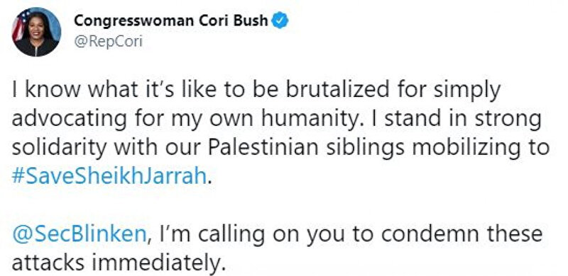 ABD'de iktidardaki Demokrat Partili siyasetçiler, ABD Başkanı Joe Biden'ın aksine, işgal altındaki Doğu Kudüs ve Gazze'de İsrail güçlerinin yol açtığı şiddet olaylarına tepki gösterdi. Afro-Amerikalı Temsilciler Meclisi üyesi Bush, "Zulme uğramak nedir bilirim" dedi. Massachusetts Senatörü Elizabeth Warren da Twitter hesabından yaptığı paylaşımda, Filistinlilerin Doğu Kudüs'ten zorla tahliye edilmesini "iğrenç ve kabul edilemez" şeklinde niteleyerek, "ABD, İsrail hükümetine tahliyelerin yasa dışı olduğunu ve derhal durdurulması gerektiğini açıkça söylemeli." ifadesini kullandı.