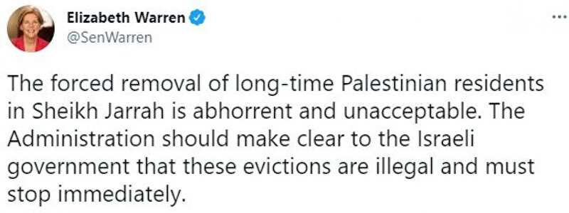Bir diğer aday adayı, Massachusetts Senatörü Elizabeth Warren da Twitter hesabından yaptığı paylaşımda, Filistinlilerin Doğu Kudüs'ten zorla tahliye edilmesini "iğrenç ve kabul edilemez" şeklinde niteleyerek "ABD, İsrail hükümetine tahliyelerin yasa dışı olduğunu ve derhal durdurulması gerektiğini açıkça söylemeli." ifadesini kullandı.