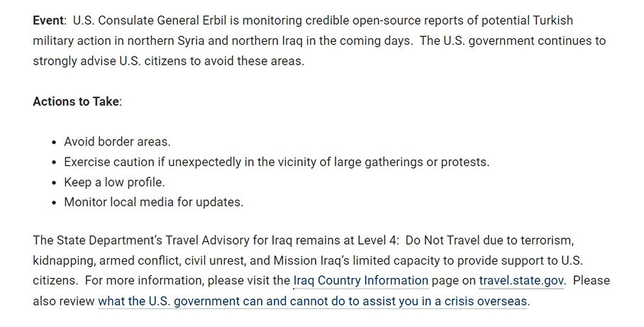 ABD Erbil Başkonsolosluğu, web sitesi üzerinden yayımladığı duyuruyla Türkiye’nin Irak ve Suriye’nin kuzeyine operasyon düzenleyebileceğini ifade etti.