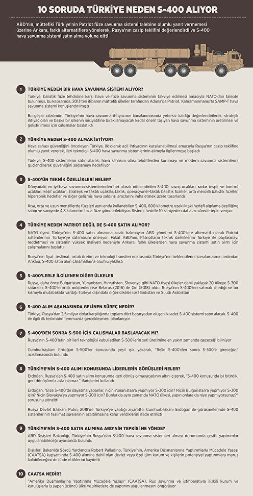 ABD'nin, müttefiki Türkiye'nin Patriot talebine olumlu yanıt vermemesi üzerine Ankara, kendi hava savunma sistemlerini satın alma yoluna gitti. Türkiye, ABD'nin Patriotların teknik özelliklerini paylaşmayı reddetmesi ve sistemin yüksek maliyeti nedeniyle, Rusya'nın cazip teklifini değerlendirerek S-400 satın almaya karar verdi. Günümüzün en önemli askeri teknolojilerin başında gelen S-400 sistemiyle ilgili anlaşmayı yapan Türkiye, hava sahasını olası tehditlerden korumayı ve modern savunma sistemlerini güçlendirerek güvenliğini tesis etmeyi amaçlıyor.