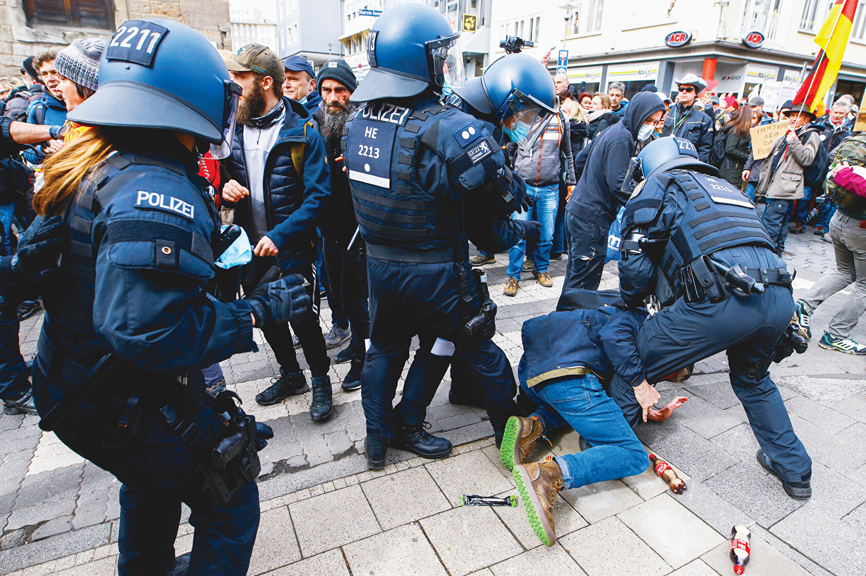 Almanya’da da hükümetin yeni tip koronavirüs (Kovid-19) salgınının yayılmasını önlemek için aldığı önlemlerini protesto gösterilerinde çok sayıda kişi gözaltına alındı. Kassel kentindeki eylemde çoğu kişi maske ve mesafe kurallarına ve polisin dağılmaları yönünde çağrılarına uymadı. Polisin kapattığı yoldan geçmek isteyen göstericilerle polis arasında arbede yaşandı. Polis göstericilere karşı biber gazı, cop ve tazyikli su kullandı. Göstericiler ise polise şişe attı ve gazetecilere saldırdı. Çok sayıda kişinin gözaltına alındığı gösteriye 10 bin kişi katıldı. Başkent Berlin’de de aşırı sağcılar Kovid-19 tedbirlerini protesto etti. Polis, maske ve mesafe kurallarına uyulmadığı gerekçesiyle eylemi sonlandırdı.