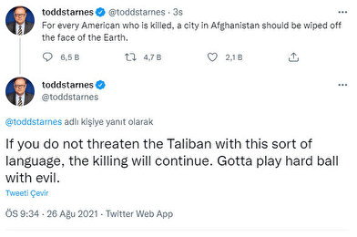 FOX News'te radyo moderatörlüğü yapan ABD'li sunucu Todd Starnes, Kabil'de ABD askerlerinin de hayatını kaybettiği terör saldırılarının ardından skandal bir tweet attı. Starnes, "Öldürülen her Amerikalı için Afganistan'daki bir şehir yeryüzünden silinmelidir." ifadesini kullandı.