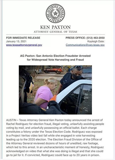 Paxton'a göre, San Antonio'dan Rachel Rodriguez, 2020 seçimleri öncesinde oy toplama ile ilgili bir videoda tespit edildi ve yaptığı şeyin yasadışı olduğunu kabul etti.