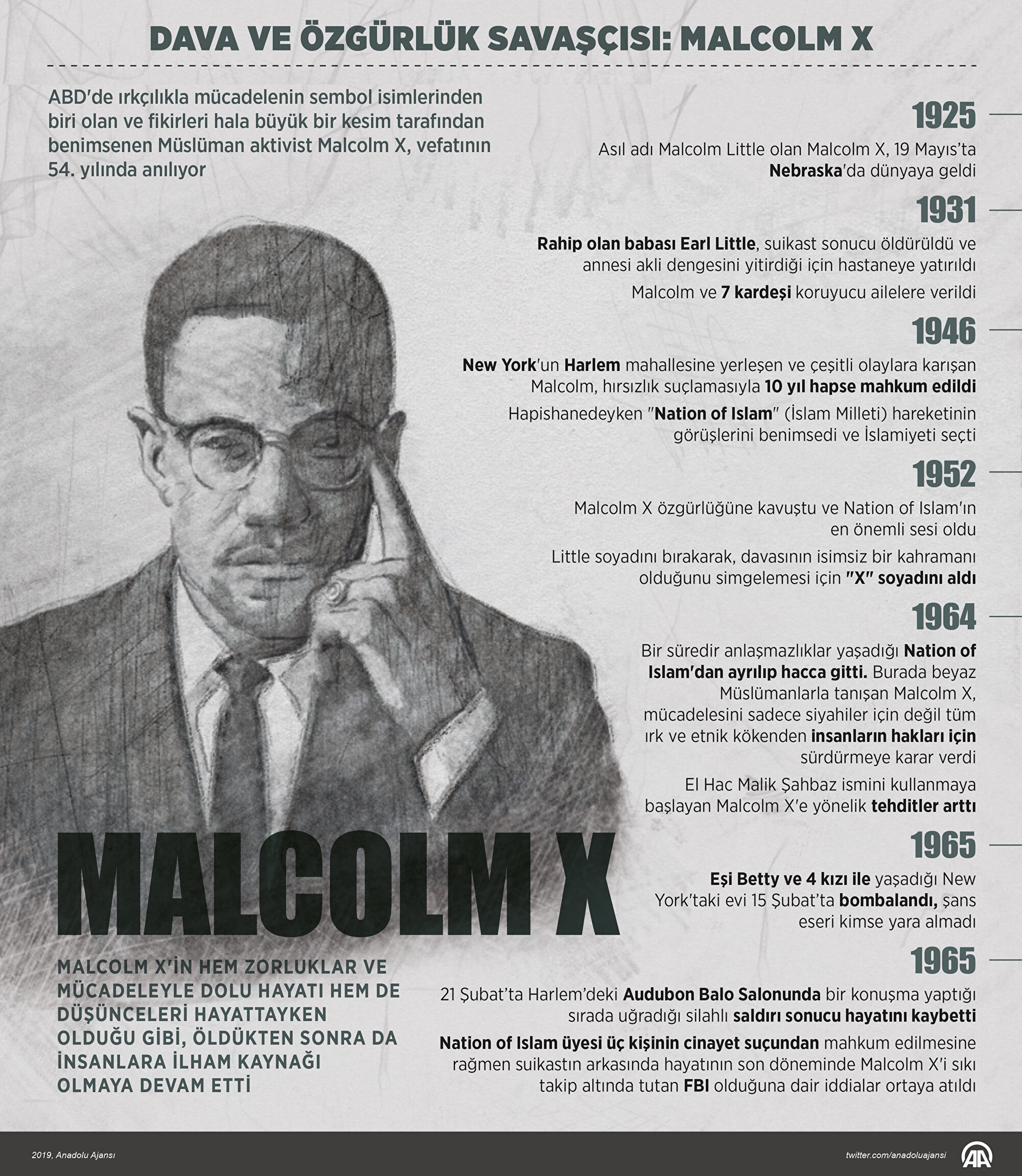 20'nci yüzyılın en etkin kişilerinden birisi olan Malcolm X, 19 Mayıs 1925 tarihinde, ABD’nin orta eyaletlerinden olan Nebraska'da dünyaya geldi.