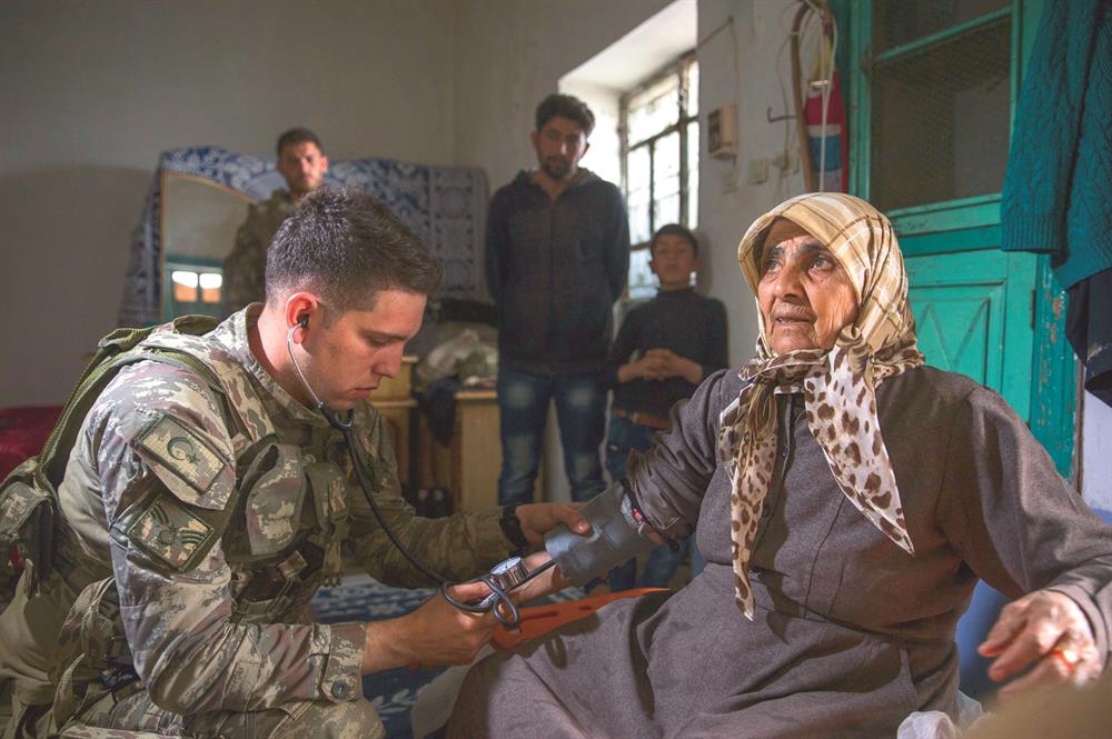 Afrin halkının güvenliği için gece sokaklarda devriye gezen Mehmetçik, gündüz de gıda yardımında bulunup sağlık taraması yapıyor. Zırhlı araçlarla çevre köyleri gezen Mehmetçiğe bölge halkı sevgi gösterilerinde bulunuyor. Çocuklarla da yakından ilgilenen askerler, onlara çikolata ve lokum ikram ediyor. Askeri sağlık görevlileri mahallede sağlık taraması yaparken, ilaç dağıtılan ve şikayetlerine çözüm bulan halk, Mehmetçiğe minnettarlığını bildiriyor.