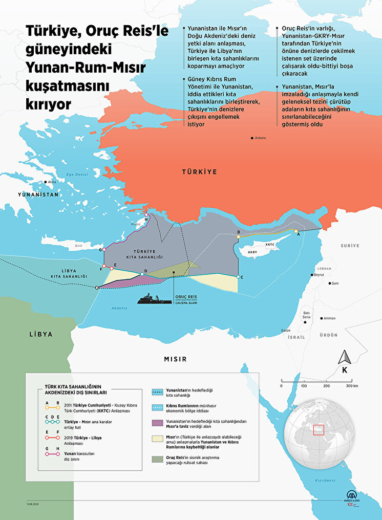 Yunanistan, Güney Kıbrıs Rum Yönetimi (GKRY) ve Mısır, Türkiye'yi ana karasına hapsetme planları peşinde koşarken, Türkiye bu plana Oruç Reis'in Doğu Akdeniz'deki sismik araştırma faaliyetlerini sürdürerek yanıt veriyor.
