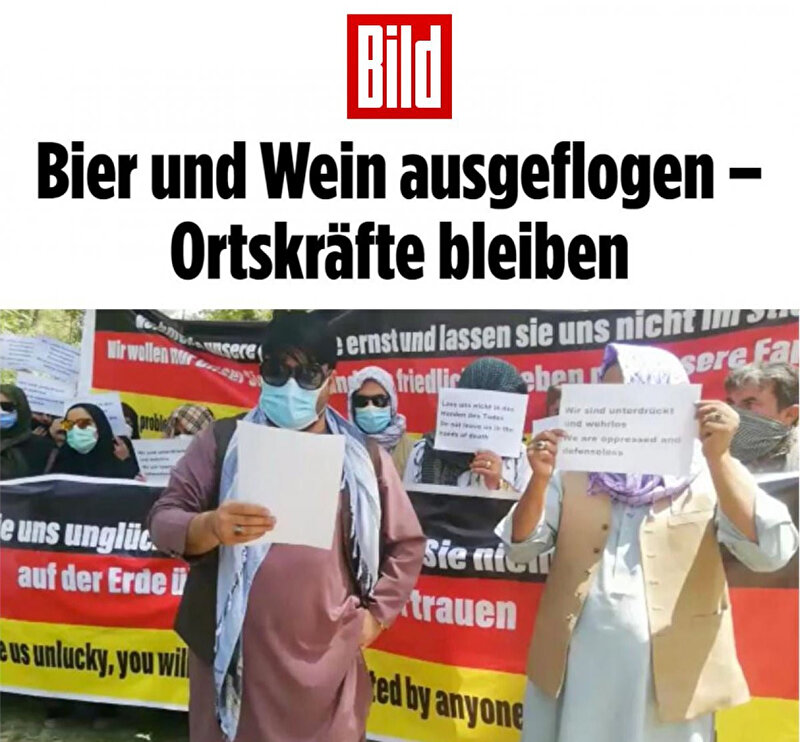 Afganistan'da Taliban'ın kontrolündeki başkent Kabil'den tahliyeler sürerken, Almanya tepkilerin odağına oturdu. Almanya'nın haziranda Alman ordusuna ait bira ve şarapları Afganistan’dan geri getirdiği ortaya çıktı. Ancak Berlin yönetimi, Alman askerleri için çalışan Afgan yerel personelini ülkeden tahliye edemedi. Haberde, yerel Afgan çalışanların Kabil'de düzenlediği gösteriden bir kareye yer verildi.