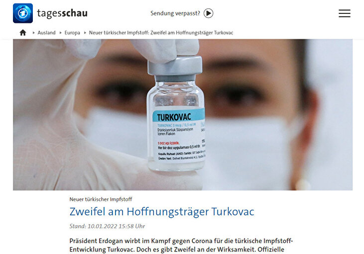 Alman medyasından Tagesschau, Türkiye'nin Kovid-19 aşısını kötüleyen bir haber yayımladı. Tüm aşamaları bilimsel komisyonlar tarafından onaylanan Turkovac'ın etkinliği hakkında şüpheler olduğunu öne sürdüler. Tagesschau, haberinde salgının başından beri Kovid’le mücadeleyi sekteye uğratmak için yalanlara başvuran ve sık sık terörle anılan Türk Tabipleri Birliği'ni referans olarak gösterdi.