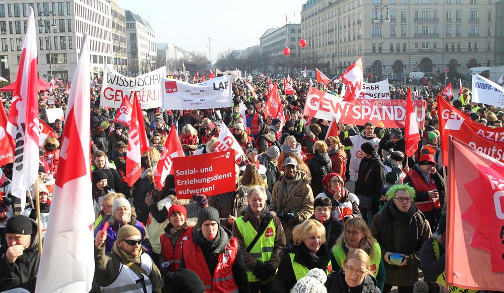 Almanya'da kamu çalışanları ücret artış talebiyle birçok eyalette grev yaptı. Göstericiler, üzerinde "Öğretmenler için daha fazla para", "Adil maaş", “Biz buna değeriz. Sosyal mesleklerin itibarını arttırın" yazan dövizler taşıdı.