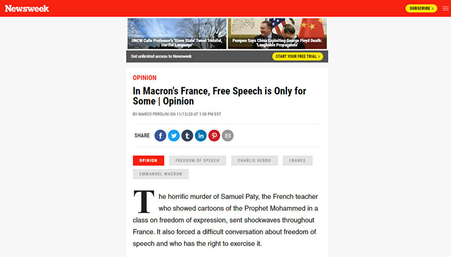 Amerikan haber dergisi Newsweek, Fransa’da Müslümanlara yönelik ayrımcılığı gözler önüne seren bir analiz yayımladı. Yazıda, Macron'un yönetimindeki Fransa'da, Müslümanların ifade ve din özgürlüklerinin baskı altında olduğu vurgulandı.