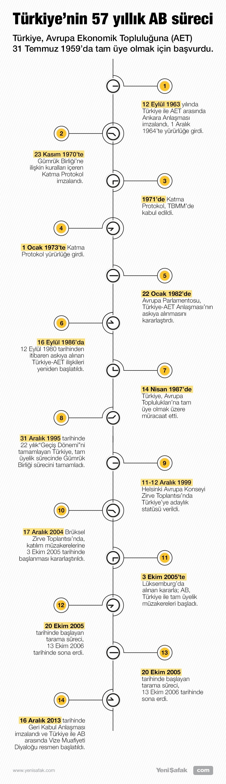 Avrupa Parlamentosu, bugün Türkiye ile yapılan müzakerelerin durdururup durdurulmamasını oyluyor. Birçok Avrupalı liderin "Kaybımız olur" görüşünü savunduğu müzakereler için AP'deki 2 büyük grup "Müzakereler dondurulsun" dedi. Parlamento'da yapılan oylama, Avrupa Birliği'nin Türkiye'ye karşı 57 yıldır gösterdiği ikircikli tavrı akıllara getirdi. 1959'da başlayan ilişkiler, 'sonu gelmeyen müzakereler' halinde devam ederken, AB son olarak verdiği 'vize muafiyeti' sözünü de tutmadı.
