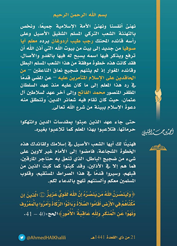 "Bu kahraman Müslüman halk ve onun cesur komutanı, İslam'a komplo kuranların ve kin besleyenlerin naralarından etkilenmeyip bu tarihi mekanı, muzaffer Sultan Fatih Sultan Mehmet'in döneminde olduğu gibi İslam çağrısının yayıldığı bir mekana dönüştürme konusunda ilerleyerek başarılı bir adım atmıştır" ifadesini kullanan Halili, Osmanlı sultanlarından sonra gelenlerin kutsal mekanların kudsiyetini ihlal ettiğini dile getirdi.