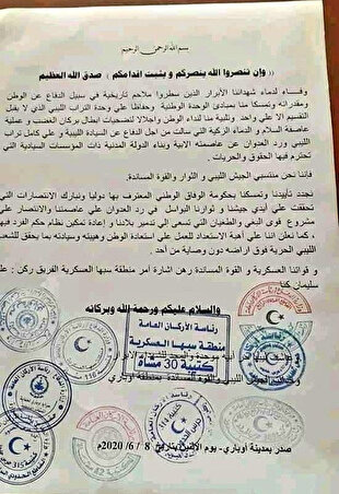 “Öfke Volkanı ve Barış Fırtınası harekatları kahramanlarının ve Libyalıları savunmak için dökülen kanın ve yine Libya'nın güvenliği istikrarı için şehit edilen Libya ordusuna saygı gösteriyoruz. Türkiye'nin yardımına desteğine de teşekkür ediyoruz. Biz, Libya ordusunun kuruluşu, destekleyici güçler ve uluslararası kabul görmüş Ulusal Mutabakat Hükümeti’ne (UMH) olan bağlılığımızı yineliyoruz. Hafter'in kirli amaçlarını da kınıyoruz"