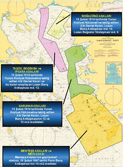 “12 Adalar, Trablusgarb Savaşı sonrasında İtalyanlar tarafından işgal edildi. 1912’deki Uşi Anlaşması ile Trablusgarp ve Bingazi İtalya’ya verildi. Buna karşılık İtalya, 12 Ada’yı boşaltıp Osman’ya devredecekti. Fakat hemen sonra 1. Balkan Savaşı ve Yunanistan’ın Ege adalarını işgali başlayınca bu devir teslim gerçekleşmedi. Lozan’ın 15. maddesi ile 12 Adalar, İtalya egemenliği altında bırakıldı. 2. Dünya Savaşı’ndan sonra 1947’de Paris Anlaşması ile 12 Ada İtalya’dan alınıp Yunanistan’a verildi. Uluslararası anlaşmalar hukukuna göre bir anlaşmanın maddesi değişirse mutlaka taraf olan devletlerin tamamının ya da çoğunluğunun o değişiklikte imza atması lazım. Şimdi 12 Ada Lozan’ın 15. maddesinde geçiyordu. Türkiye Lozan’da taraftı ancak Paris’te taraf değildi. Dolayısıyla burada gayri hukuki bir devir oldu. Hukuken Türkiye’nin onayı ve rızası olmadan böyle bir devir yapılamaz. İtalya 12 Ada üzerindeki egemenlik haklarından vazgeçtiği zaman hukuken aslına rücû ediyor. Yani Türk toprağı oluyor. Yunanistan bu işgal ettiği adalardaki vatandaşlarına tapu veremiyor. Neden? Çünkü bize ait.”