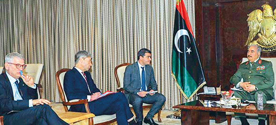 Libya’nın başkenti Trablus’a saldırılarını artıran terör örgütü lideri Hafter’e salı günü Avrupa’dan üst düzey ziyarette bulunuldu. Hafter’i ziyaret eden heyette Fransa Cumhurbaşkanı Macron, Almanya Başbakanı Merkel ve İtalya Başbakanı’nın siyasi danışmanları yer aldı. Görüşmenin yapıldığı odada bir Doğu Akdeniz haritası bulunması, “Gündem Türkiye miydi?” sorusuna sebep oldu.