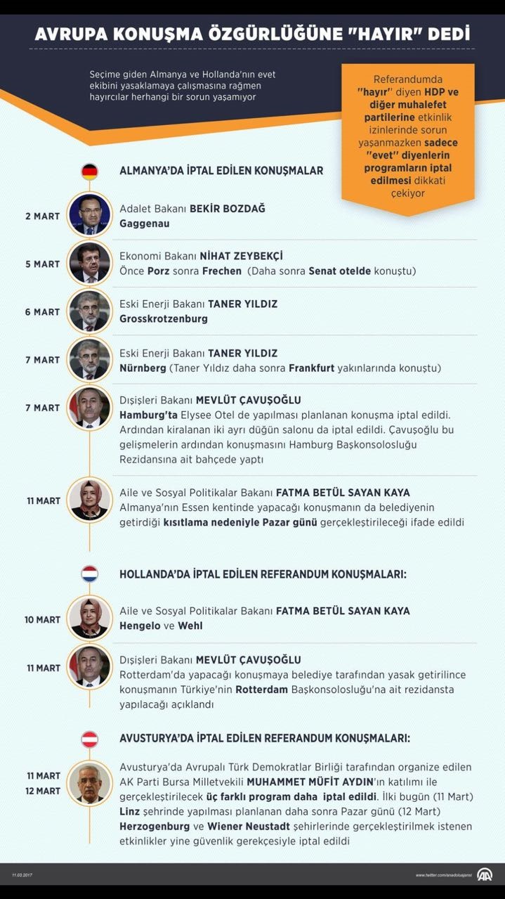16 Nisan’da Türkiye’de yapılacak olan Anayasa değişikliği referandumu, Avrupa ülkelerini bir hayli rahatsız etti. Türkiye’ye karşı sansür uygulamasına ilk olarak Almanya öncülük yaptı. Almanya'nın ardından Hollanda ve Avusturya'da benzer açıklamalar yaparak Türkiye'ye olan düşmanlıklarını ortaya koydu.