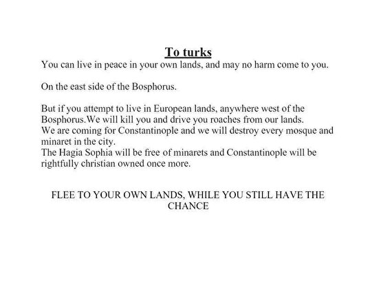- "Topraklarınızda huzur içinde yaşayabilirsiniz, size zarar gelmeyecek. Boğaz'ın Doğu yakasında. Ama Boğaz'ın Batı yakasında bir yerde yaşamayı denerseniz, Avrupa'ya gelirseniz sizi öldüreceğiz"Konstantinopolis'e gelir, tüm cami ve minareleri yıkarız. Ayasofya minarelerden kurtulacak ve Konstantinapol hak edildiği gibi tekrar Hristiyan şehri olacak"