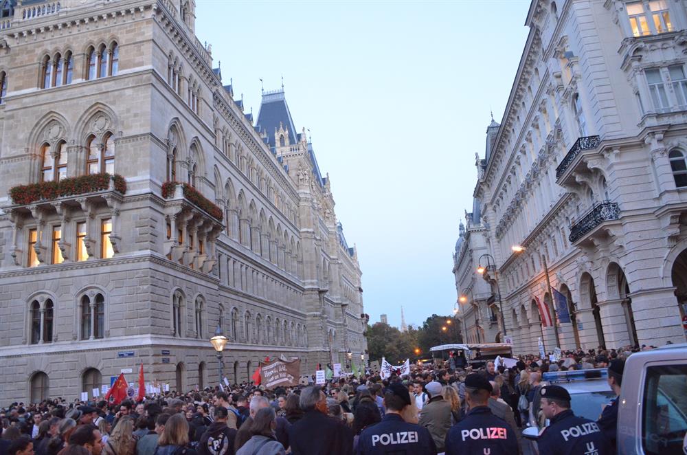 Polisin geniş güvenlik önlemi aldığı gösteride, protestocular şehrin işlek caddelerini trafiğe kapatarak, yaklaşık 5 kilometrelik bir yürüyüşün ardından Viyana Şehir Kütüphanesi önüne ulaştı.
